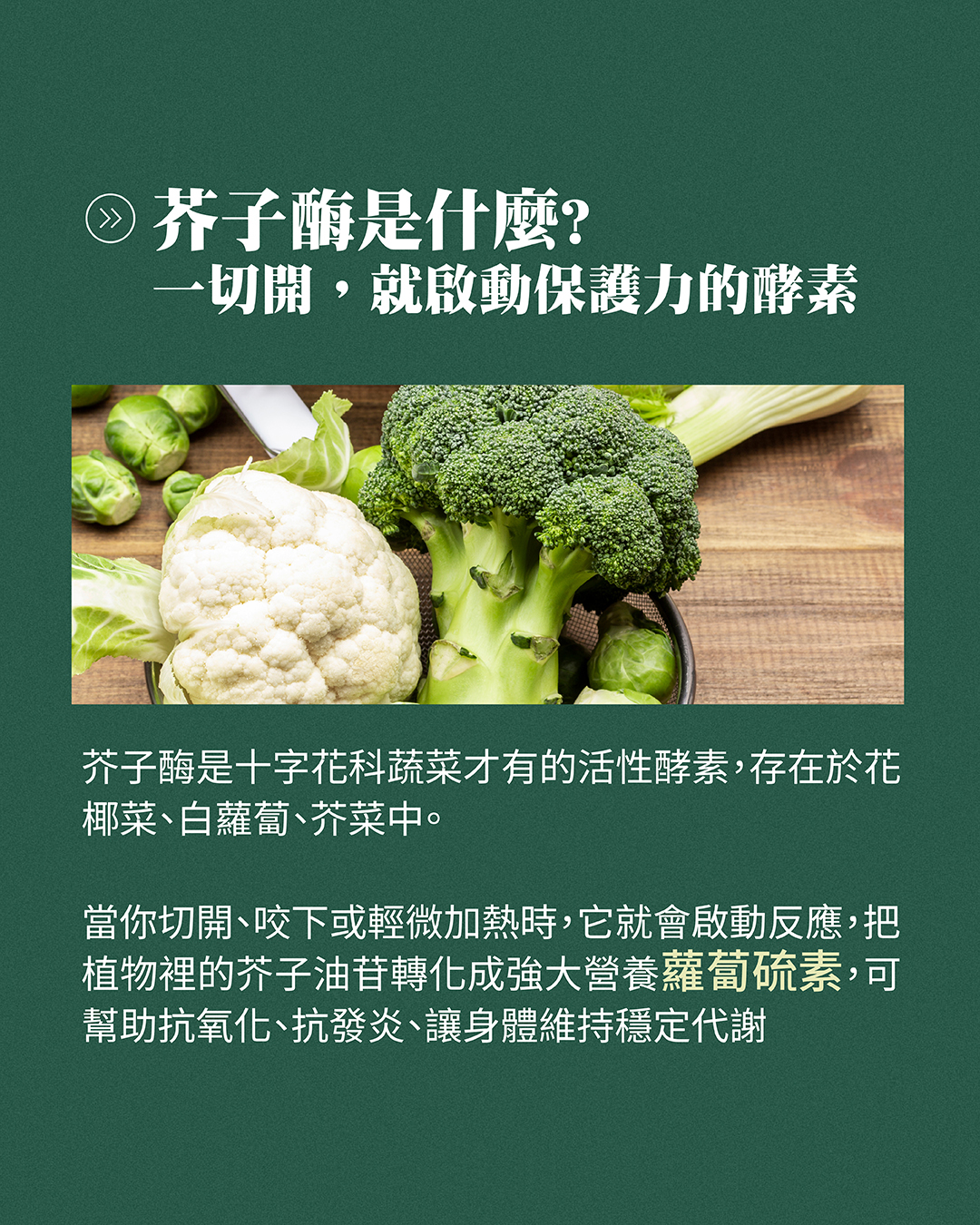 你知道嗎?我們平常吃的花椰菜、白蘿蔔和芥菜裡,其實藏著一種厲害的酵素——芥子酶(Myrosinase)。它屬於十字花科蔬菜特有的天然活性酵素,也常被稱為黑芥子酶。