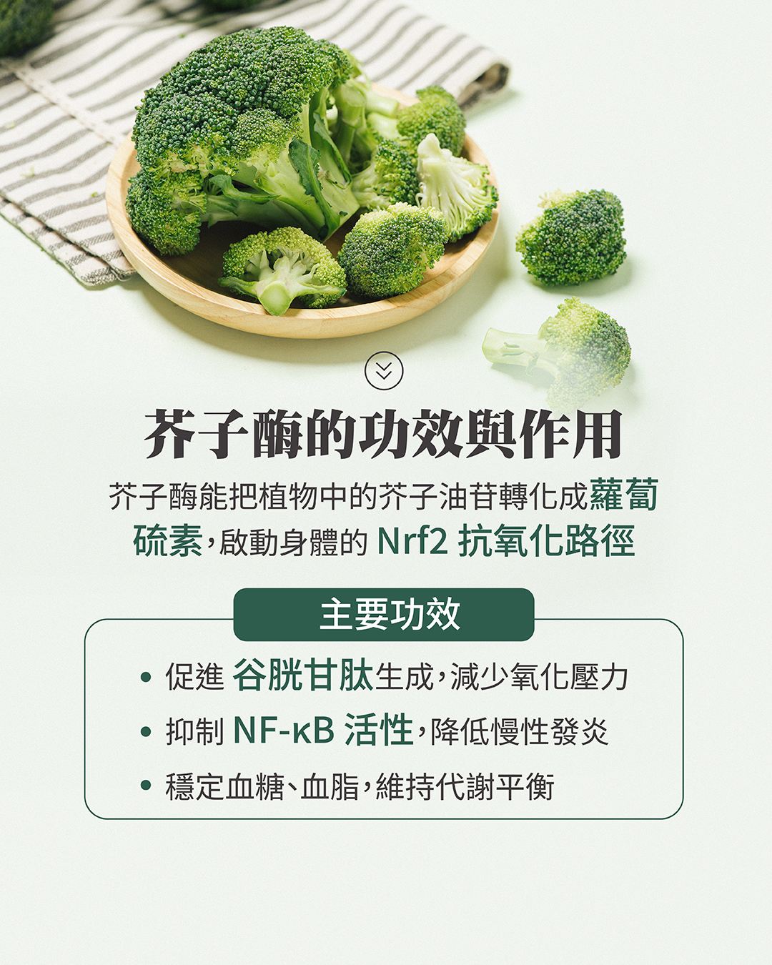 這種天然酵素在作用時,會將植物中的芥子油苷轉化成蘿蔔硫素——一種能啟動人體「Nrf2 抗氧化路徑」的關鍵物質。簡單來說,它就像打開身體防護罩的開關,讓細胞開始自我防禦,製造更多谷胱甘肽(GSH)等抗氧化酵素,減少氧化壓力造成的傷害。