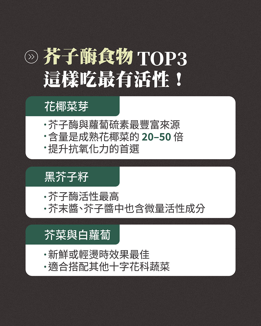 芥子酶補充不需刻意追求高劑量,重點在於來源新鮮、活性保留與攝取方式。無論是從黑芥子酶食物還是保健品取得,只要選對型態、搭配正確,就能讓芥子酶發揮最佳健康效益。