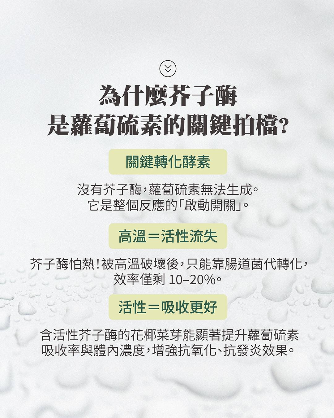 沒有芥子酶,蘿蔔硫素就無法被有效生成。這個酵素是整個反應的觸發者,負責將植物中的營養原料轉化成真正能被人體利用的活性成分。