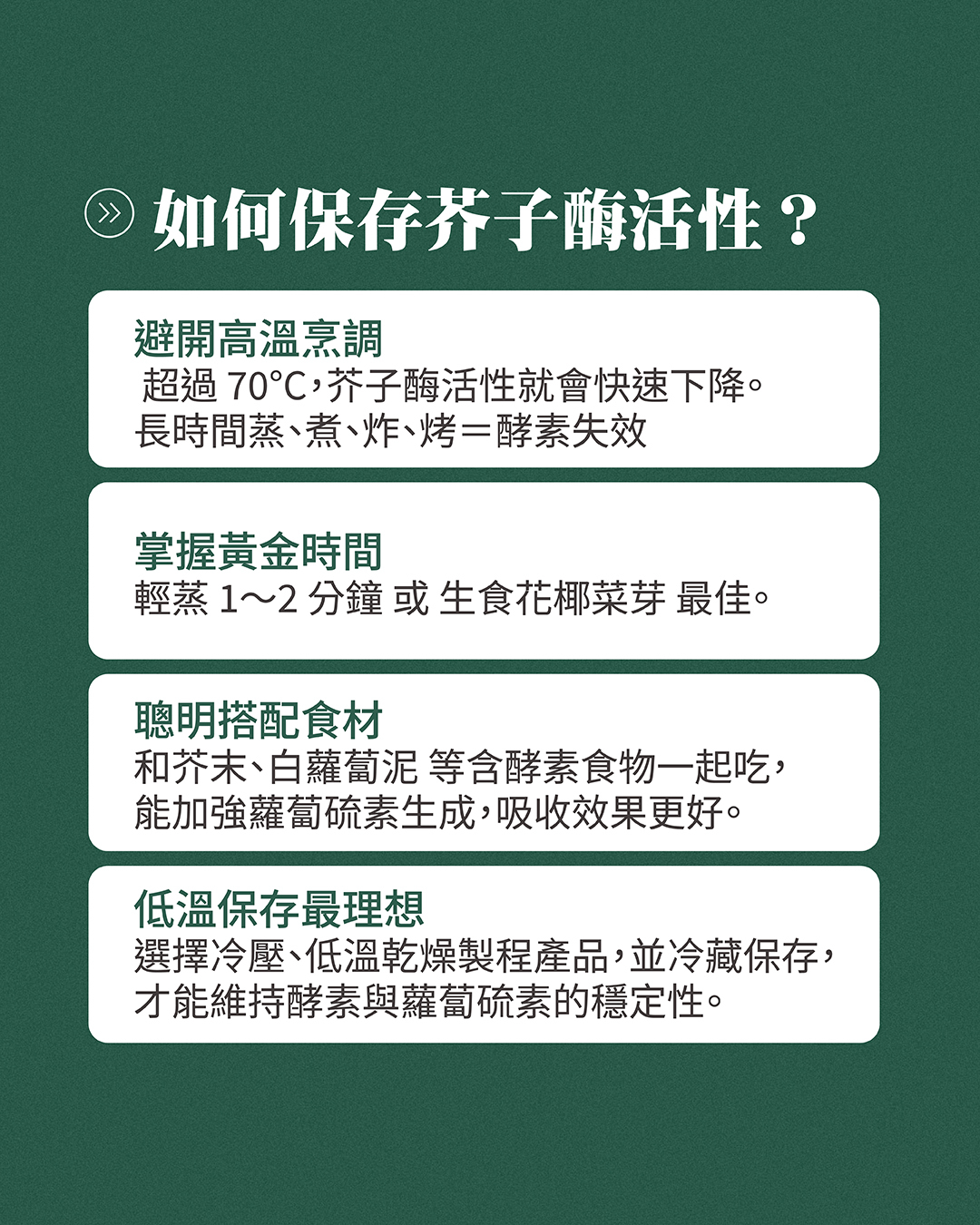 若是製成芽菜粉、冷壓汁或保健產品,應選擇低溫乾燥、冷壓製程的版本,並冷藏保存。這樣才能最大程度維持芥子酶與蘿蔔硫素的穩定性與活性。