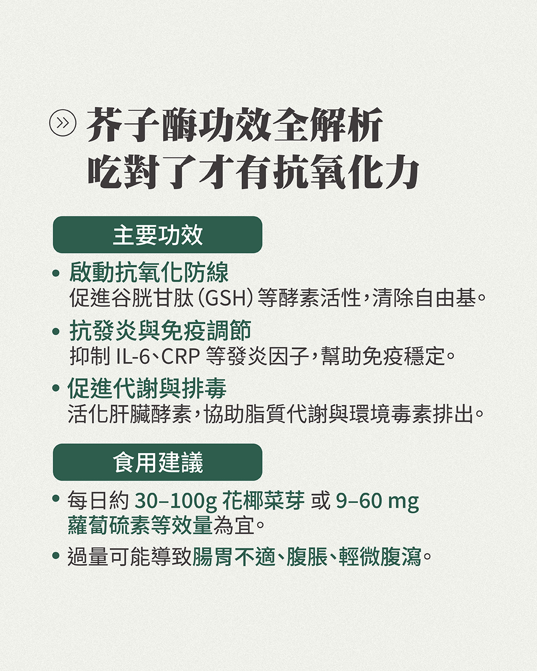 研究顯示,補充含活性芥子酶的花椰菜芽產品,能顯著提高蘿蔔硫素的吸收量與體內濃度,是維持抗氧化與抗發炎效果的關鍵。