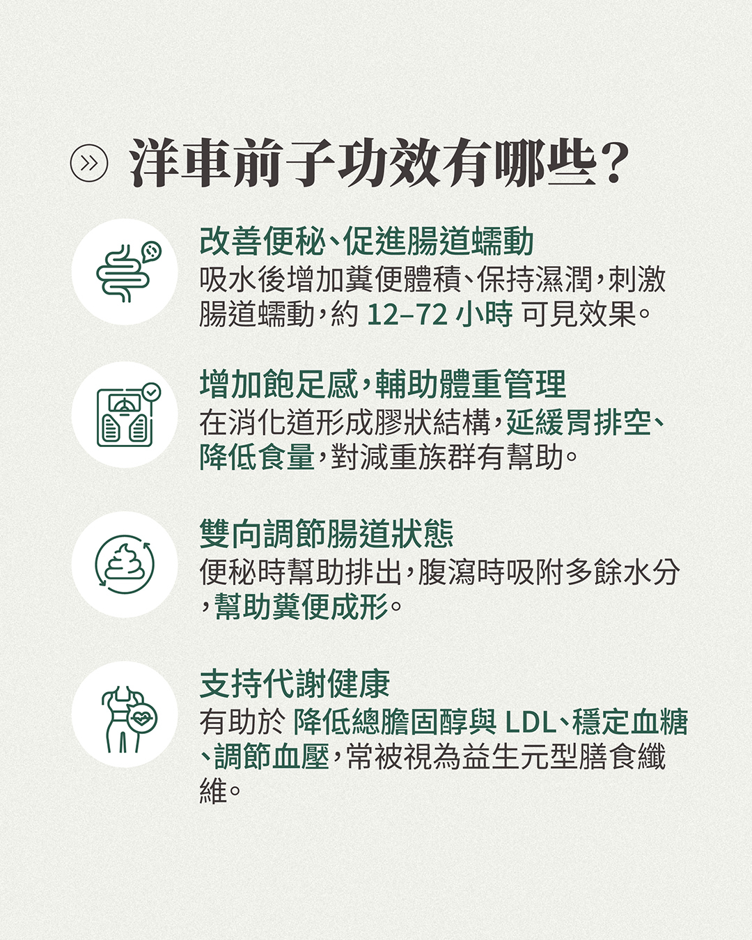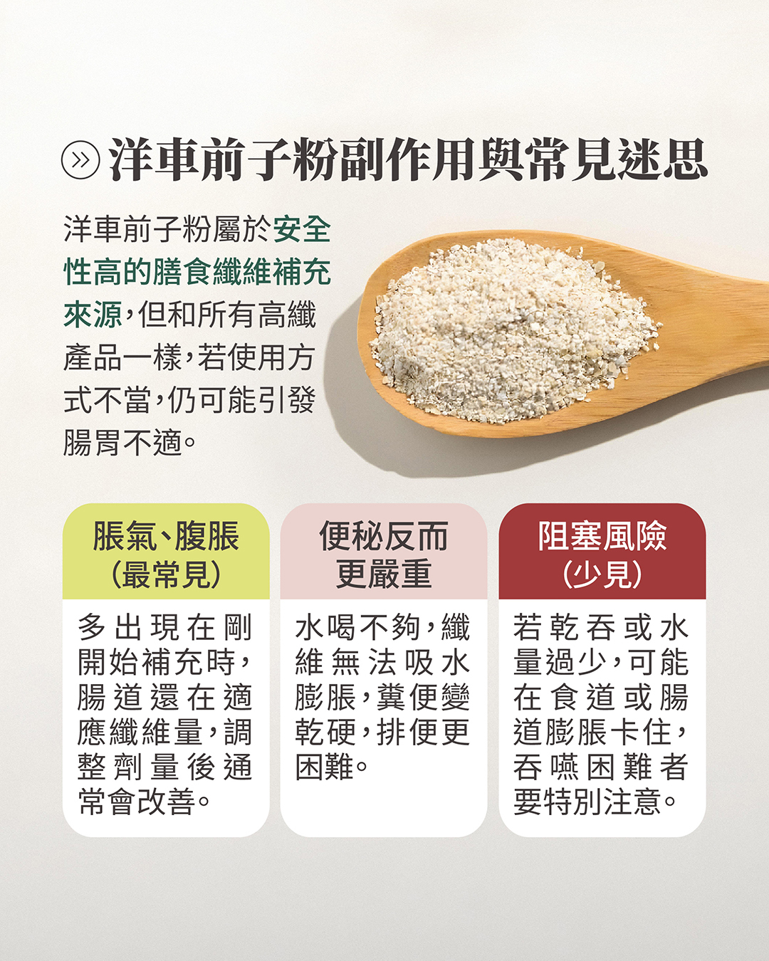 透過正確的吃法與劑量控制,洋車前子粉才能真正發揮其作為水溶性膳食纖維的優勢,成為腸道健康的助力,而不是負擔。