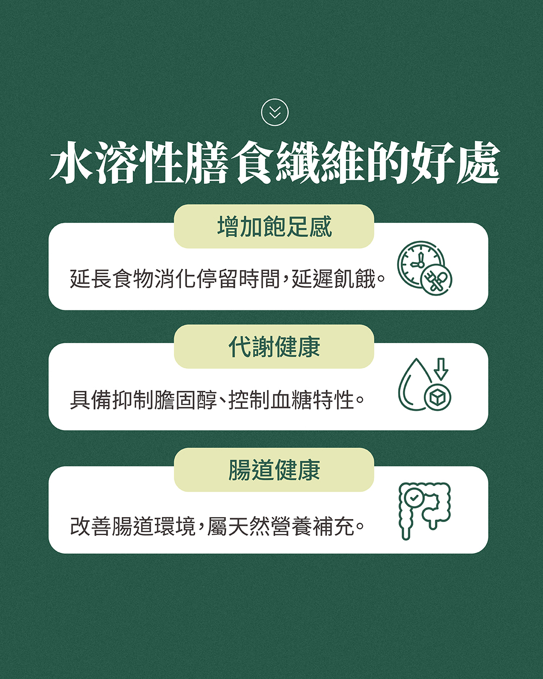 代表著水溶性膳食纖維除了能夠延遲飢餓感,還具備抑制膽固醇還有控制血糖攝取的特性,因此水溶性膳食纖維對於想要進行體態、飲食控制的人來說,是既健康又天然的營養補充選擇。