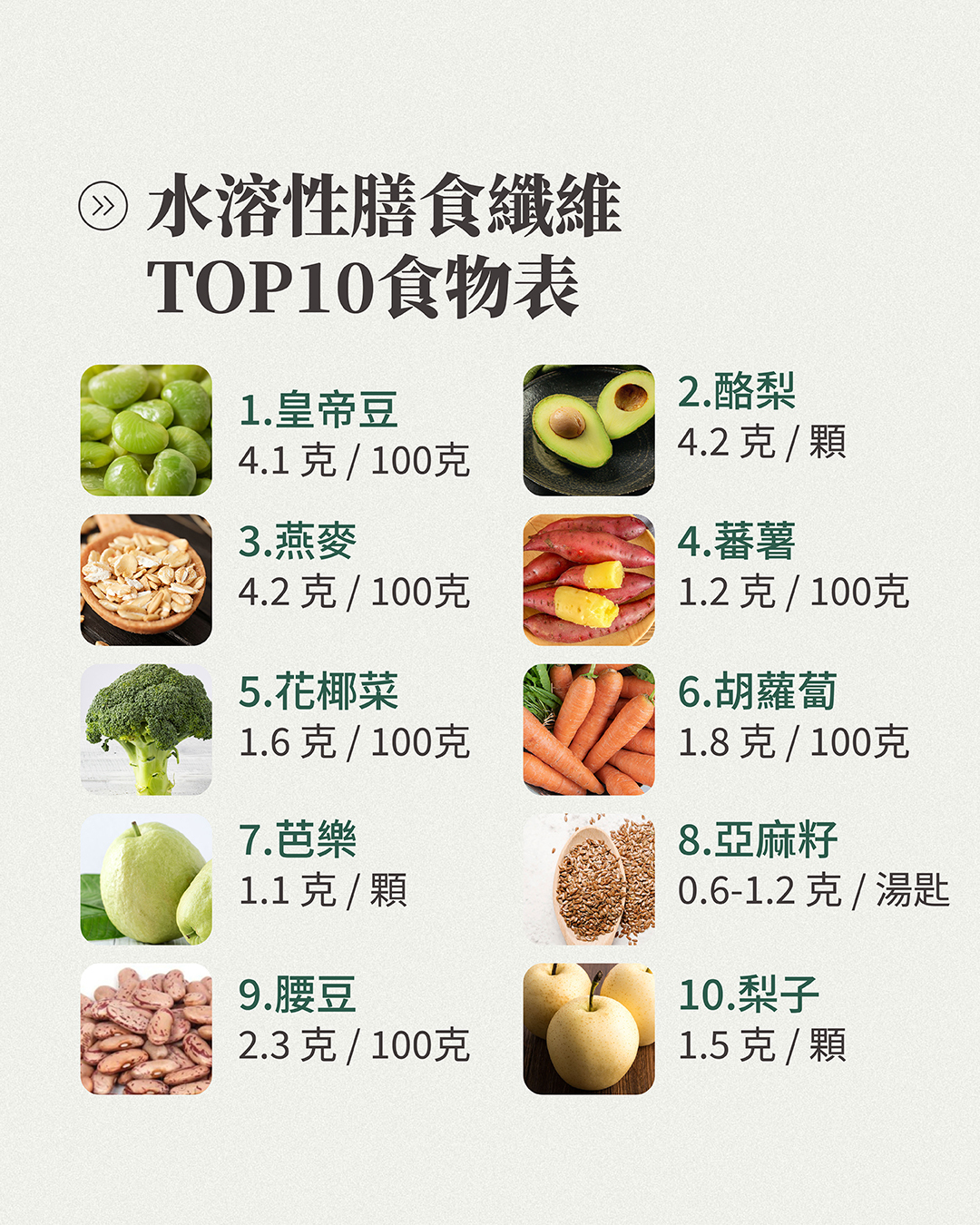 皇帝豆、酪梨、燕麥、梨子、花椰菜、紅蘿蔔、亞麻籽、腰豆、芭樂等,都是台灣常見的最佳水溶性膳食纖維來源,建議可以多元攝取讓營養更均衡。