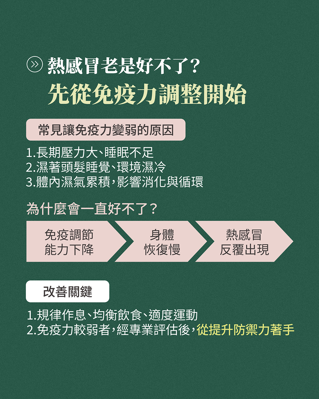 如果這些生活習慣沒有改變,體內濕氣持續存在,加上長時間待在冷氣房、流汗機會少,身體代謝與調節能力下降,熱感冒就容易反覆出現。