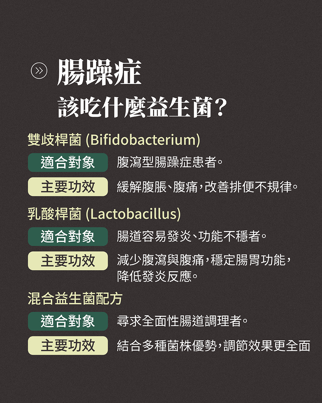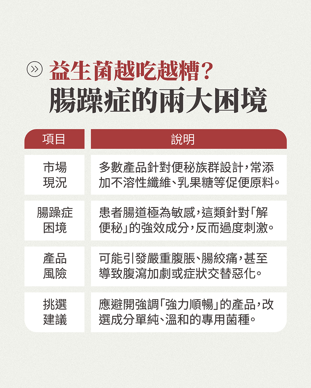 因此,腸躁症患者在選擇益生菌產品時,應避免過於刺激的促便原料,選擇專為腸躁症設計或溫和的菌種與成分。