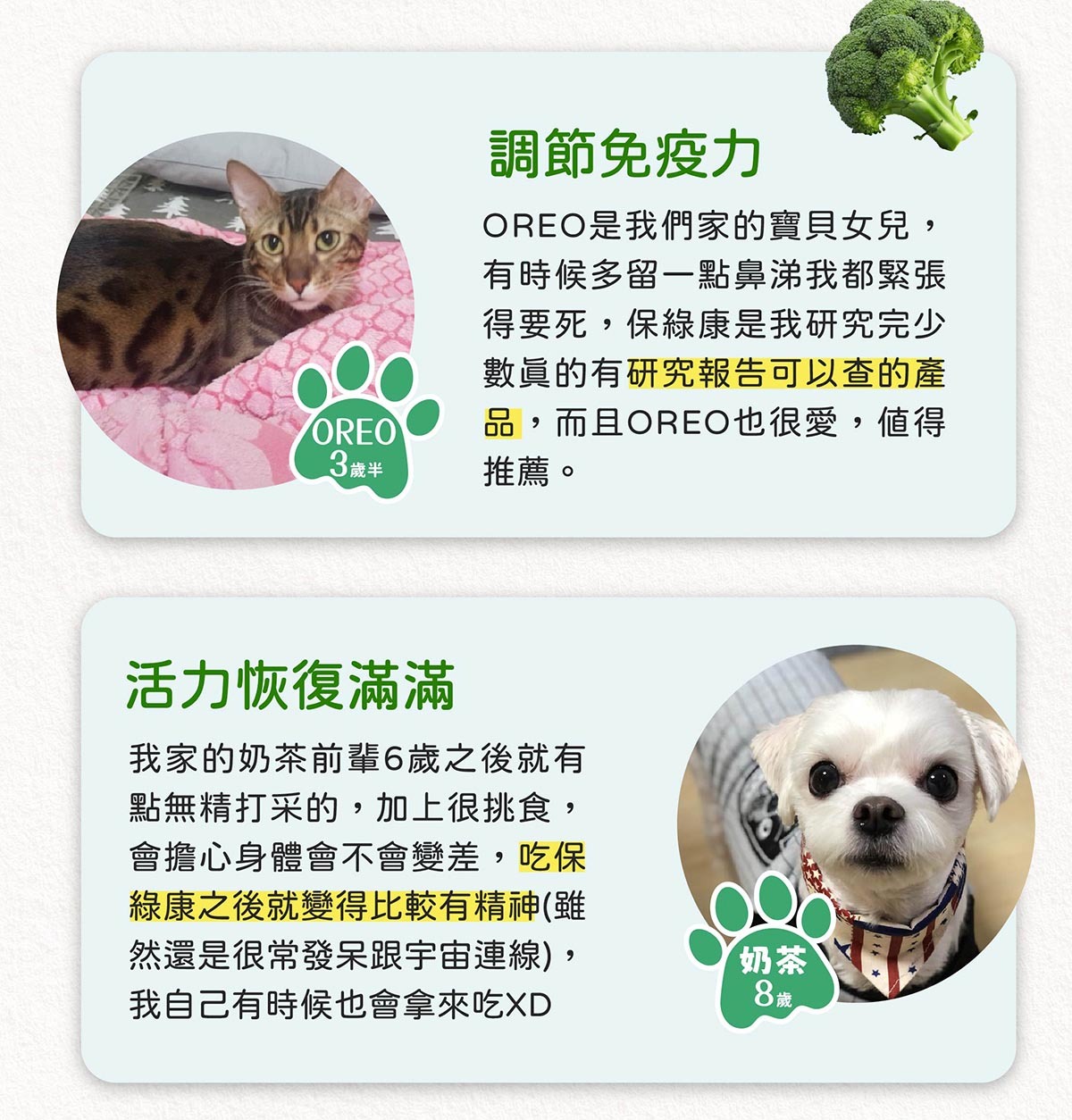 1.保綠康綠花椰菜營養素經過動物實驗(小鼠實驗),發現能有效提升調節小鼠的免疫系統,對於家中愛貓、愛犬的免疫力也有幫助。