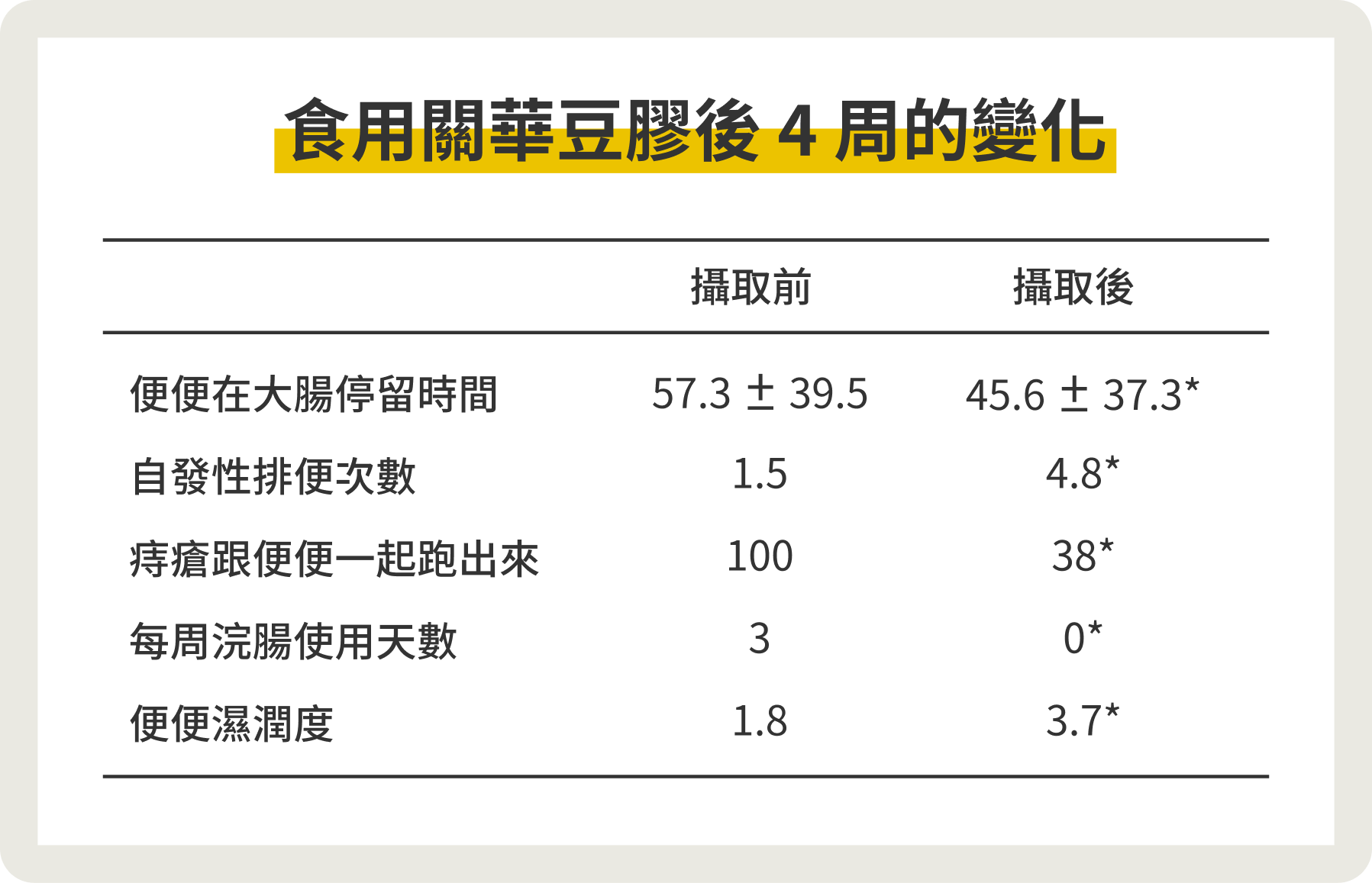 研究報告 polymeros Det at, Dig DIs Scl. 59 2207-2214 (2014)指出,在針對39名有慢性排便困擾的對象,連續食用關華豆膠後4周的變化,發現 :