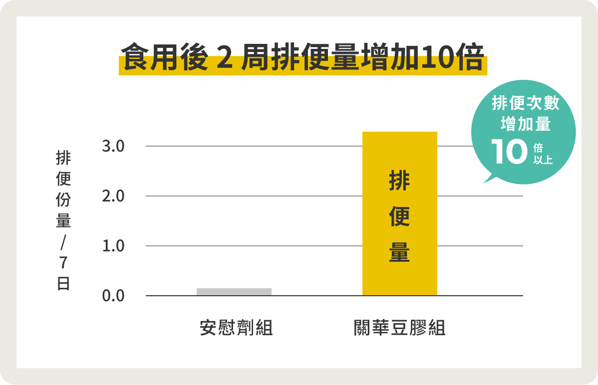 而在中川致之的健康食品研究 11,1-14(2008)中,針對有排便不順問題的男女各50名,連續食用關華豆膠兩周後的比較,兩周後發現每周排便量增加10倍以上,代表有效的刺激刺激腸胃道蠕動。