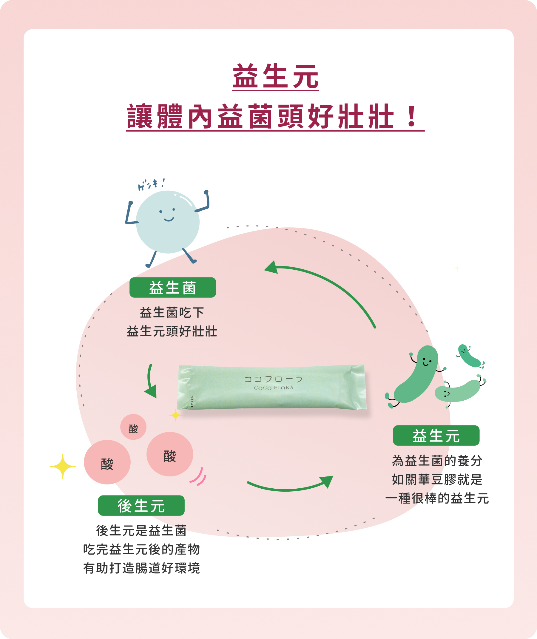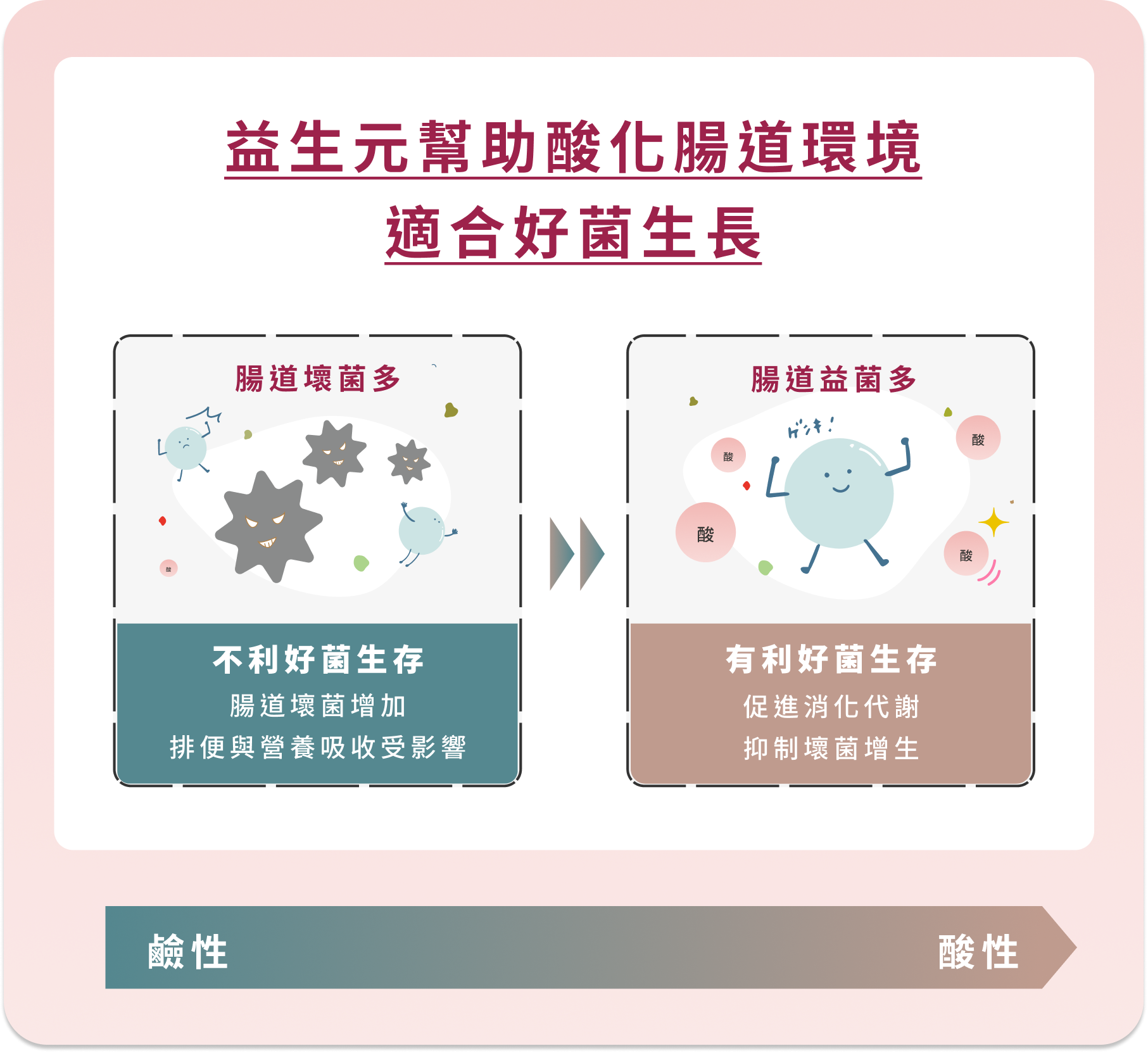 益菌在吃下益生元之後就會製造有機酸,像是短鏈脂肪酸,能夠讓腸道環境酸化,變成適合益菌居住環境,打壓壞菌。