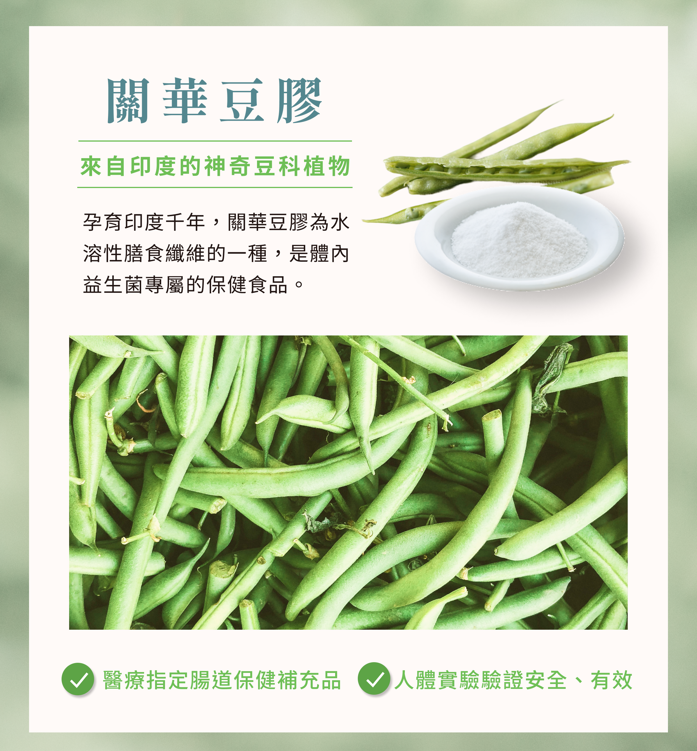 來自印度的神奇豆科植物製成,透過半水解,成為次世代的膳食纖維PHGG。關華豆膠在歐、美、日等先進國家已經風行多年,被許多醫療院所選定為指定調節腸道健康的補充品,也有許多研究報告與人體實驗證實安全性及有效性。