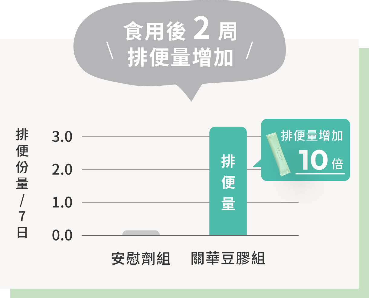 根據健康營養食品研究所的人體實驗,針對有排便不順問題的男女各50名,連續食用關華豆膠兩周後的比較,發現排便量增加10倍,有效刺激腸胃道蠕動。