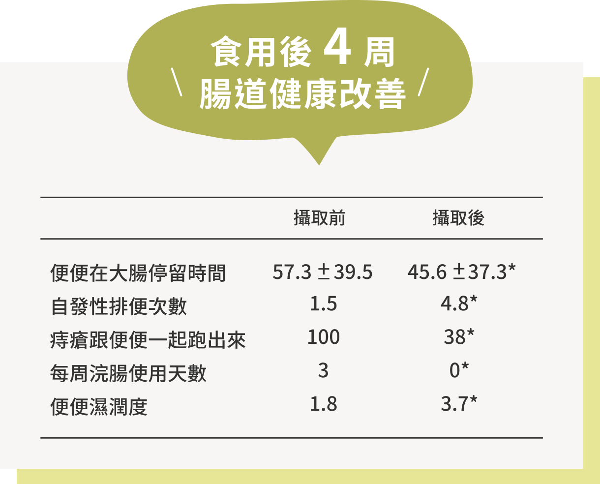 根據 polymeros Det at, Dig DIs Scl. 59 2207-2214 (2014) 的研究,針對39名有慢性排便困擾的對象,連續食用關華豆膠後4周的變化,發現: