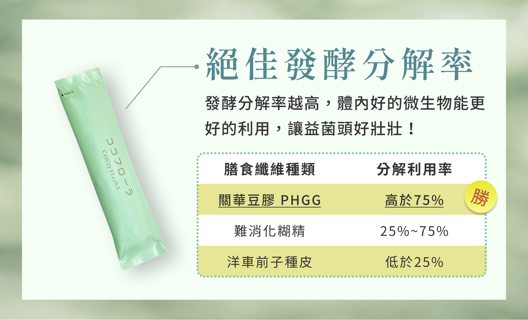 在評估益生元的品質,我們可以利用發酵分解率來判斷,發酵分解率越高表示益菌能更好的利用並產生更多的短鏈脂肪酸。根據日本政府醫藥局食品保健部公告,關華豆膠 PHGG 發酵分解率在膳食纖維中可是數一數二的好。