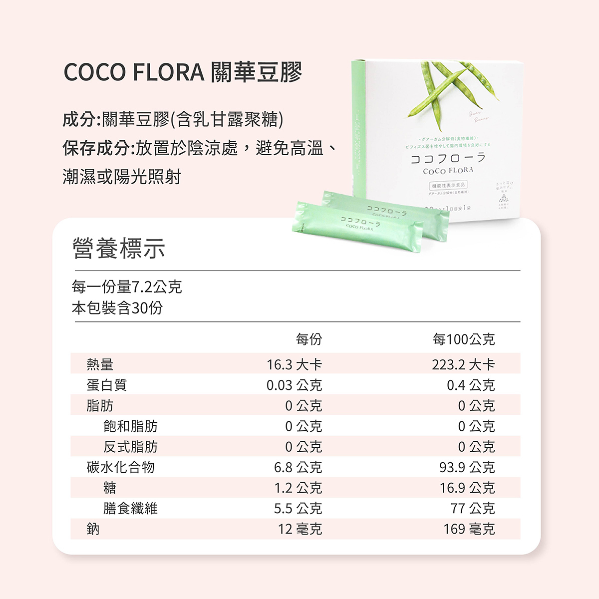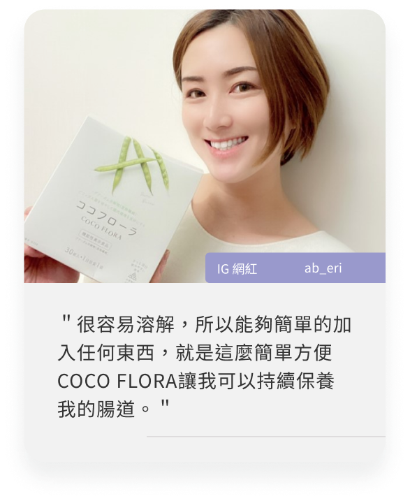 由於COCO FLORA含大量水溶性膳食纖維,剛開始食用的時候腸胃可能還不習慣,建議可以多喝水,或是先減少每日的食用量,待腸胃習慣後,再逐漸增加。