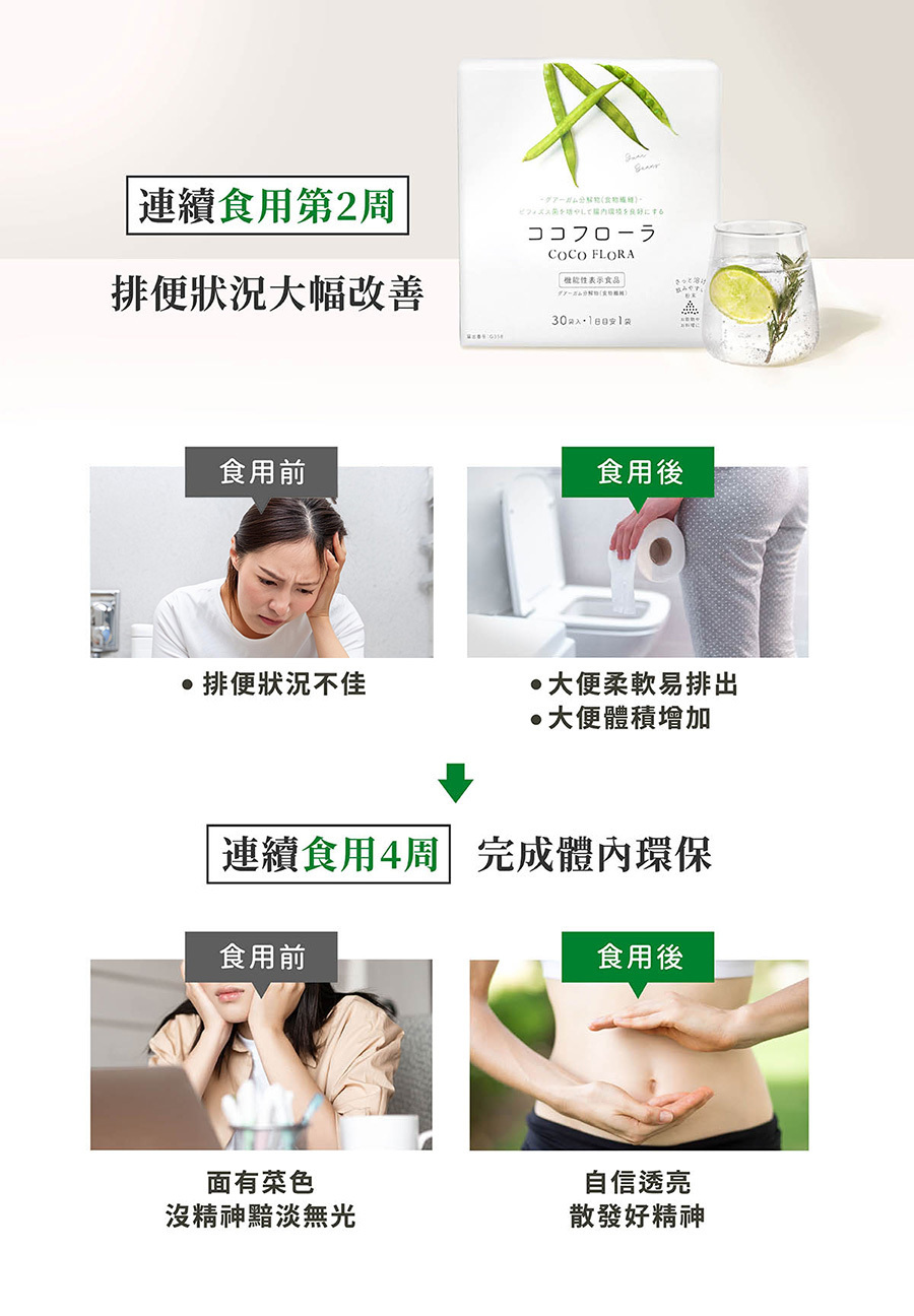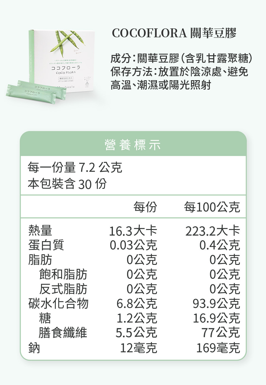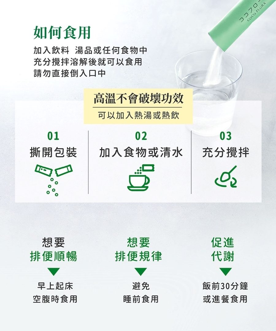 由於COCO FLORA含大量水溶性膳食纖維,剛開始食用的時候腸胃可能還不習慣,建議可以多喝水,或是先減少每日的食用量,待腸胃習慣後,再逐漸增加。