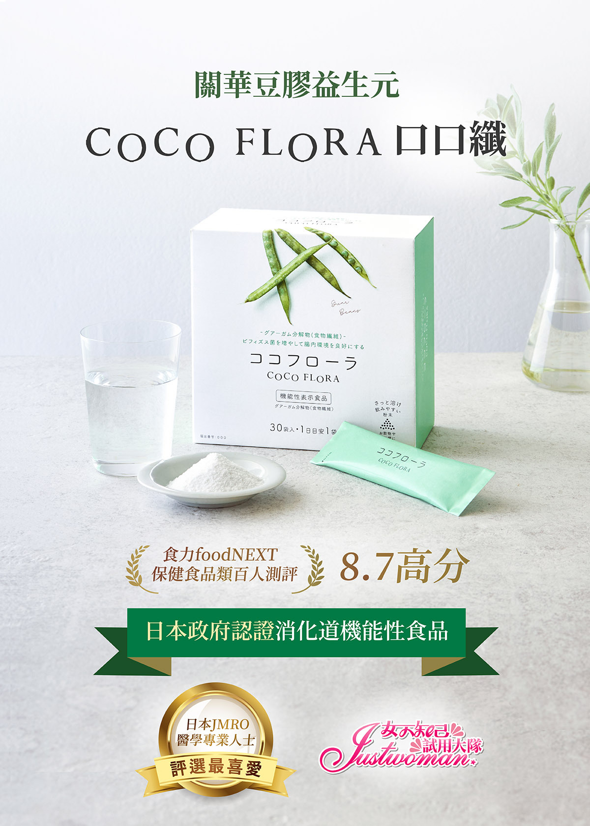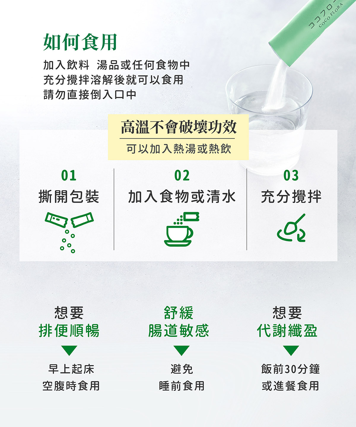 由於COCO FLORA含大量水溶性膳食纖維,剛開始食用的時候腸胃可能還不習慣,建議可以多喝水,或是先減少每日的食用量,待腸胃習慣後,再逐漸增加。